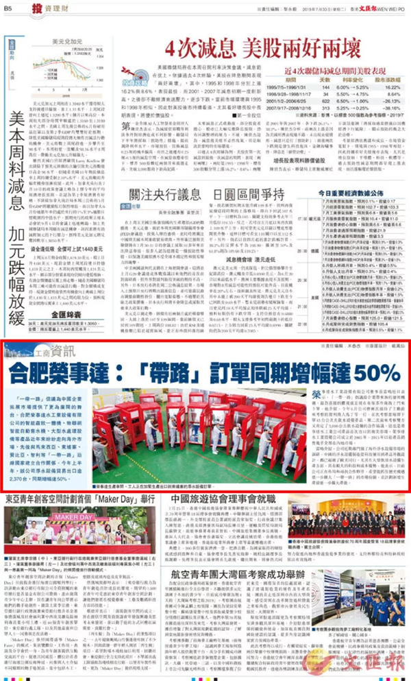 香港文匯報 《合肥榮事達 “帶路”訂單同期增幅達50%》