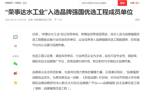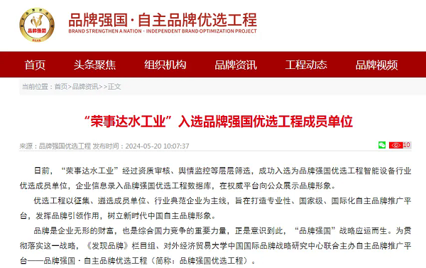 日前,“榮事達(dá)水工業(yè)”經(jīng)過資質(zhì)審核、輿情監(jiān)控等層層篩選,成功入選為品牌強(qiáng)國優(yōu)選工程智能設(shè)備行業(yè)優(yōu)選成員單位,企業(yè)信息錄入品牌強(qiáng)國優(yōu)選工程數(shù)據(jù)庫,在權(quán)威平臺向公眾展示品牌形象。