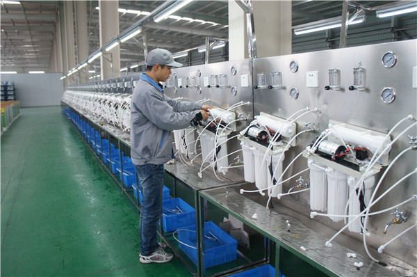 據悉,新車間配備國內先進的凈水機自動化生產線,采用可編程控制器(PLC),實現自動、轉向、垂直升降輸送;自動倍速鏈輸送,節拍控制,大幅提高了生產效率。專業化檢測線以304不銹鋼為材質,配備壓力表、漏電開關、插座、氣管及其他相關儀表,確保產品品質優良。