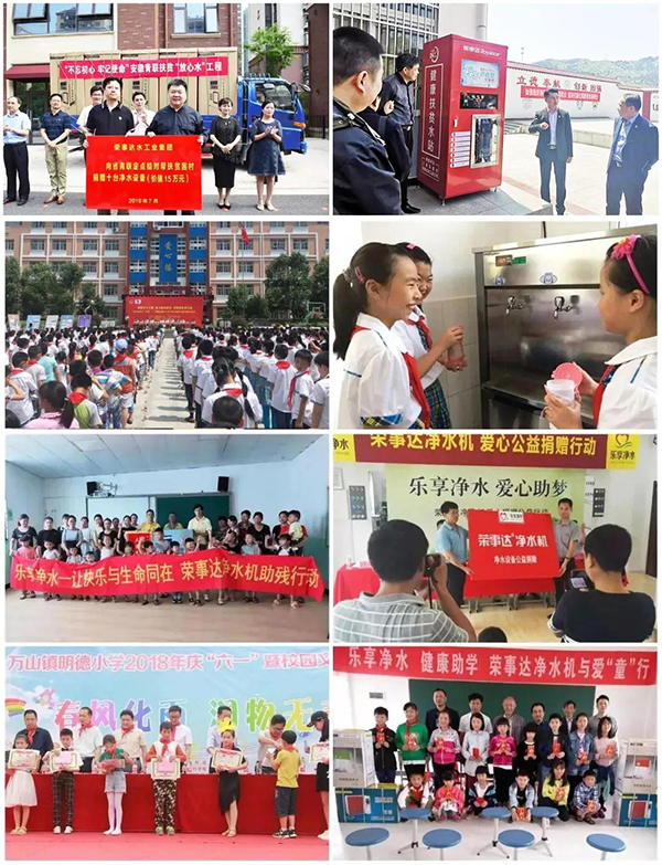 榮事達(dá)水工業(yè)從事凈水行業(yè)十余年,始終堅(jiān)守企業(yè)發(fā)展與公益事業(yè)同趨共行。榮事達(dá)自2010年發(fā)起“樂享凈水”公益行動(dòng),在全國范圍內(nèi)開展“健康助學(xué)”、“愛心助殘”、“愛心敬老”等各類公益幫扶,捐贈(zèng)、安裝凈水設(shè)備數(shù)千套;向全國首個(gè)希望小學(xué)——金寨希望小學(xué)捐贈(zèng)直飲水設(shè)備,并聯(lián)合金寨希望公益服務(wù)中心及地方公益協(xié)會(huì)共同發(fā)起“給山區(qū)孩子一杯水”——援建金寨中小學(xué)凈水設(shè)備公益活動(dòng),向金寨縣全縣中小學(xué)援建直飲水設(shè)備400多套,該項(xiàng)目也被評(píng)為“安徽省十佳學(xué)雷鋒志愿服務(wù)項(xiàng)目?jī)?yōu)秀典型”;攜手中華少年兒童慈善救助基金會(huì)發(fā)起成立“健康飲水專項(xiàng)基金”,開展各類校園飲水健康保障工作;攜手安徽?qǐng)F(tuán)省委、省青聯(lián)啟動(dòng)“青力扶貧聯(lián)創(chuàng)夢(mèng)想”健康扶貧“放心水”工程,向安徽地區(qū)多個(gè)貧困村捐贈(zèng)凈水設(shè)備,建立健康扶貧水站等。
