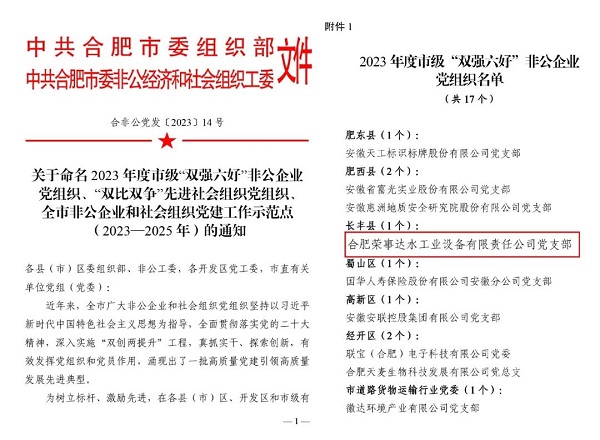 此次榮獲市級(jí)“雙強(qiáng)六好”非公企業(yè)黨組織稱(chēng)號(hào)是對(duì)我司黨支部工作的肯定,我司將珍惜這份榮譽(yù),持續(xù)加強(qiáng)黨建工作,為非公黨建工作樹(shù)立典范。2024年,榮事達(dá)水工業(yè)黨支部將深入學(xué)習(xí)貫徹習(xí)近平新時(shí)代中國(guó)特色社會(huì)主義思想,始終堅(jiān)持以黨建引領(lǐng)“雙強(qiáng)六好”為目標(biāo),再接再厲,切實(shí)抓好公司黨組織的全面建設(shè)和提升,在非公企業(yè)黨組織建設(shè)中發(fā)揮排頭兵作用,把公司的黨建工作抓實(shí)、抓好、抓出成效,為社會(huì)發(fā)展做出更大貢獻(xiàn)。
